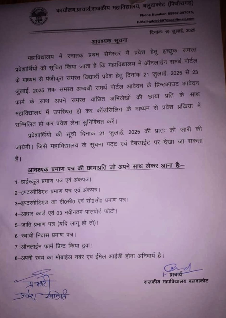 महाविद्यालय में स्नातक प्रथम सेमेस्टर में प्रवेश हेतु इच्छुक समस्त प्रवेशार्थियों को सूचित किया जाता है कि महाविद्यालय में ऑनलाईन समर्थ पोर्टल के माध्यम से पंजीकृत समस्त विद्यार्थी प्रवेश हेतु दिनांक 21 जुलाई, 2025 से 23 जुलाई, 2025 तक समस्त अभ्यर्थी समर्थ पोर्टल आवेदन के प्रिन्टआउट आवेदन फार्म के साथ अपने समस्त वांछित अभिलेखों की छाया प्रति के साथ महाविद्यालय में उपस्थित हो कर कॉउंसिलिंग के माध्यम से प्रवेश प्रकिया में सम्मिलित हो कर प्रवेश लेना सुनिश्चित करें।