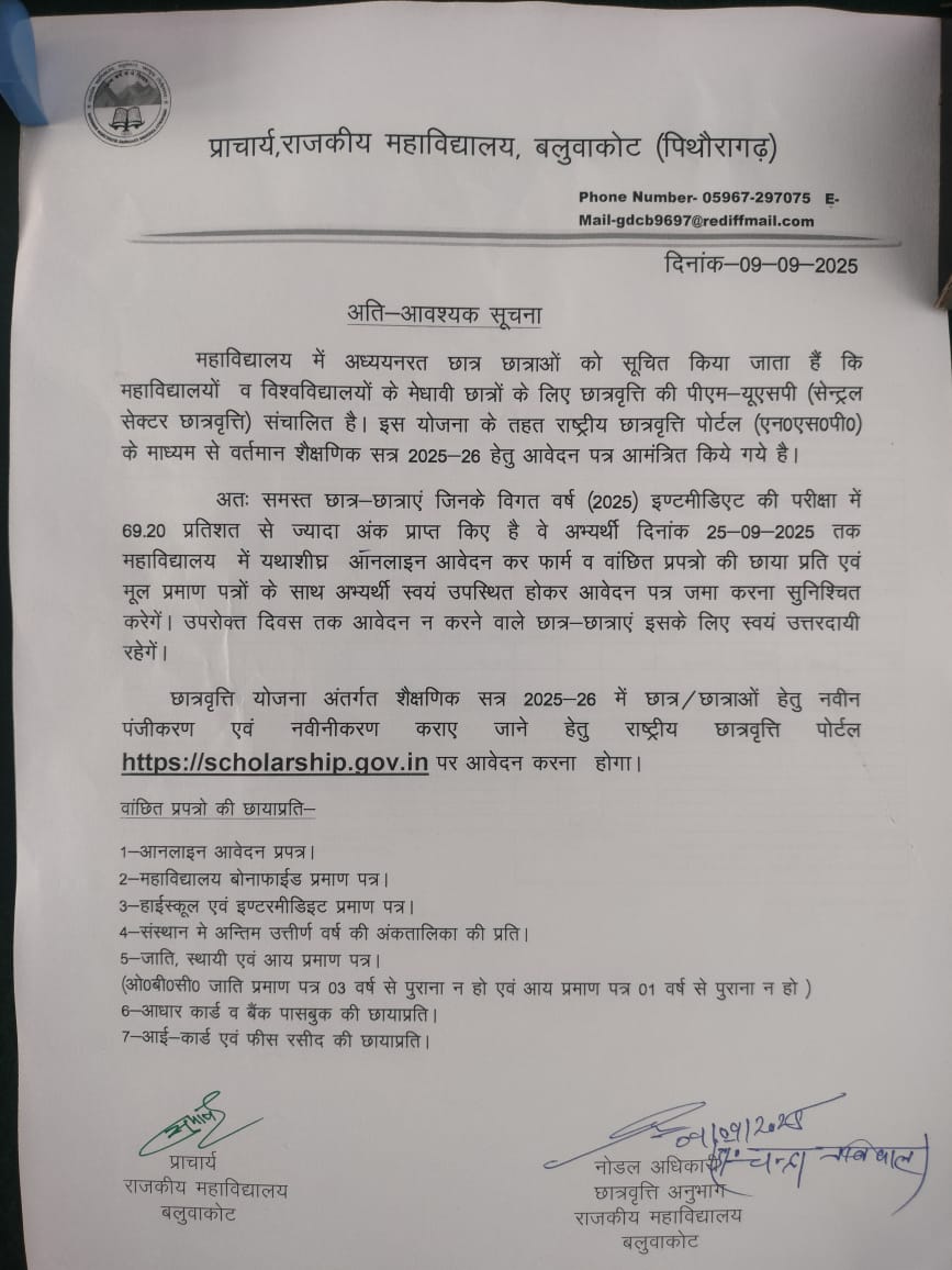 अतः समस्त छात्र–छात्राएं जिनके विगत वर्ष (2025) वार्षिक परीक्षा में 69.20 प्रतिशत से अधिक अंक प्राप्त किये हैं, वे अभ्यर्थी दिनांक 25–09–2025 तक महाविद्यालय में यथाशीघ्र ऑनलाइन आवेदन पत्र प्रस्तुत करें। वांछित पत्रक बिना विलंब के महाविद्यालय कार्यालय में प्रस्तुत करें अन्यथा छात्रवृत्ति प्राप्त करने से वंचित रहेंगे। उपर्युक्त तिथि तक आवेदन पत्र नहीं आने पर विद्यालय की कोई जिम्मेदारी नहीं रहेगी।
