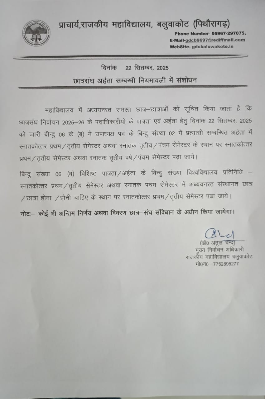 महाविद्यालय में अध्ययनरत समस्त छात्र-छात्राओं को सूचित किया जाता है कि छात्रसंघ निर्वाचन 2025-26 के पदाधिकारियों के पात्रता एवं अहर्ता हेतु दिनांक 22 सितम्बर, 2025 को जारी बिंदु 06 के (b) मे उपाध्यक्ष पद के बिंदु संख्या 02 मे प्रत्याशी सम्बन्धी अहर्ता में स्नातकोत्तर प्रथम / तृतीय सेमेस्टर अथवा स्नातक तृतीय / पंचम सेमेस्टर के स्थान पर स्नातकोत्तर प्रथम / तृतीय सेमेस्टर अथवा स्नातक तृतीय वर्ष / पंचम सेमेस्टर पढ़ा जाये।