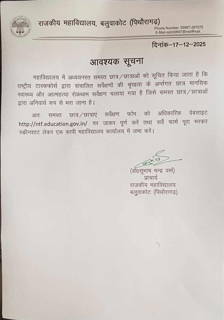 महाविद्यालय में अध्ययरत समस्त छात्र / छात्राओं को सूचित किया जाता है कि राष्ट्रीय टास्कफोर्स द्वारा संचालित सर्वेक्षणों की श्रृंखला के अन्तर्गत छात्र मानसिक स्वास्थ्य और आत्महत्या रोकथाम सर्वेक्षण चलाया गया है, जिसे समस्त छात्र / छात्राओं द्वारा अनिवार्य रूप से भरा जाना है।