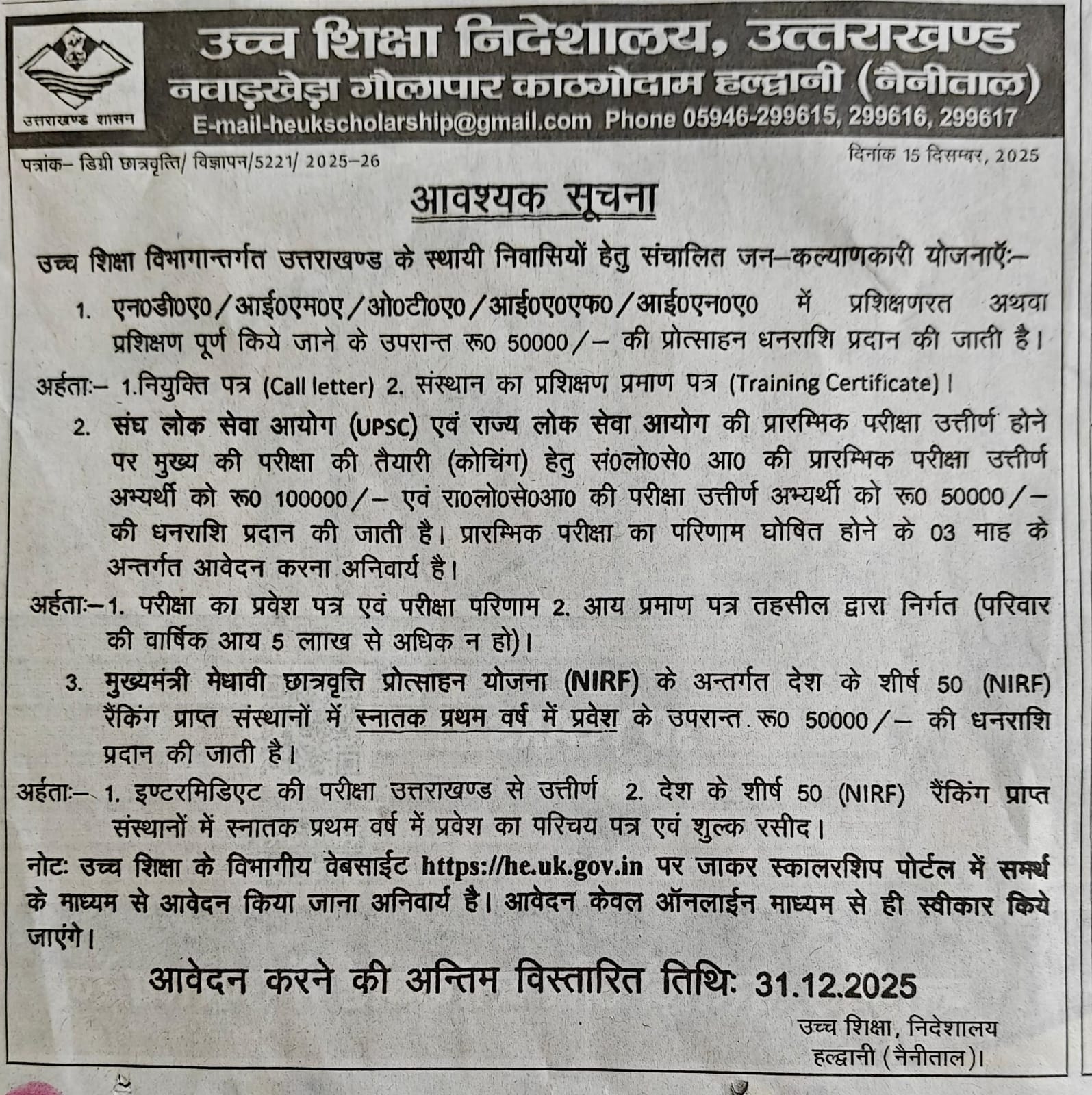 उच्च शिक्षा के विभागीय वेबसाइट https://he.uk.gov.in पर जाकर स्कॉलरशिप पोर्टल में सम्बन्धित योजना के माध्यम से आवेदन किया जाना अनिवार्य है।